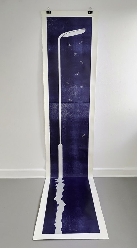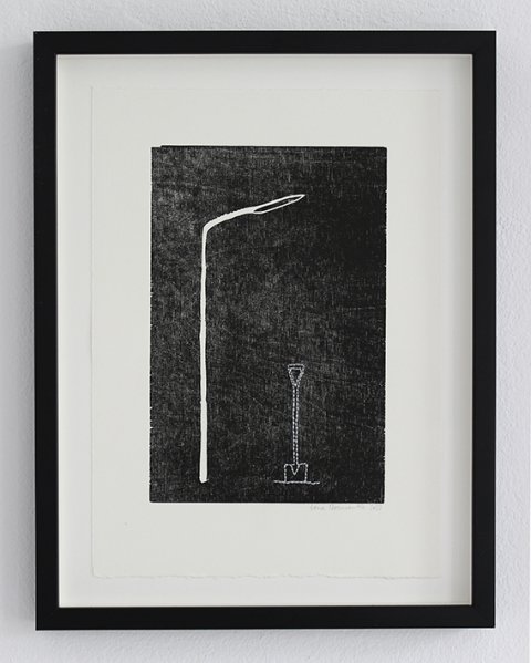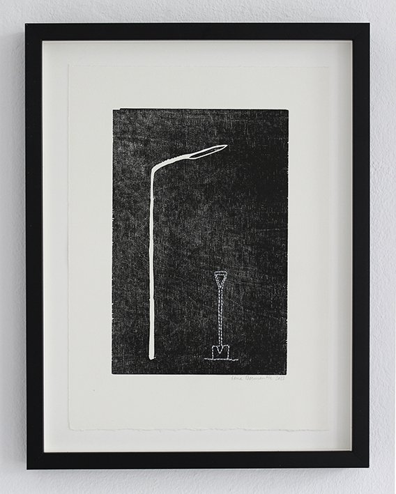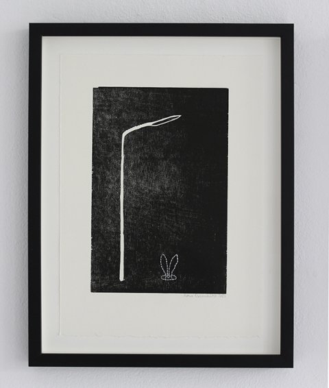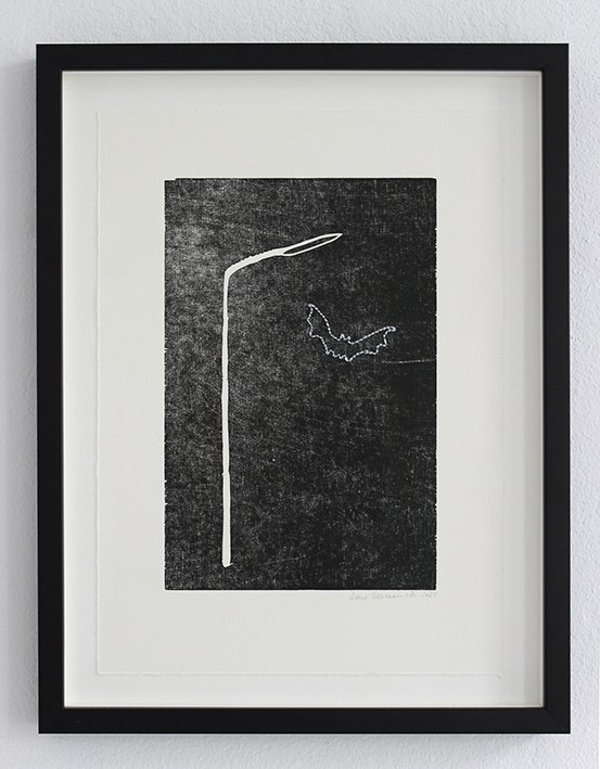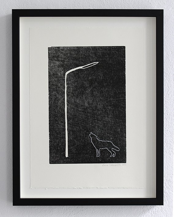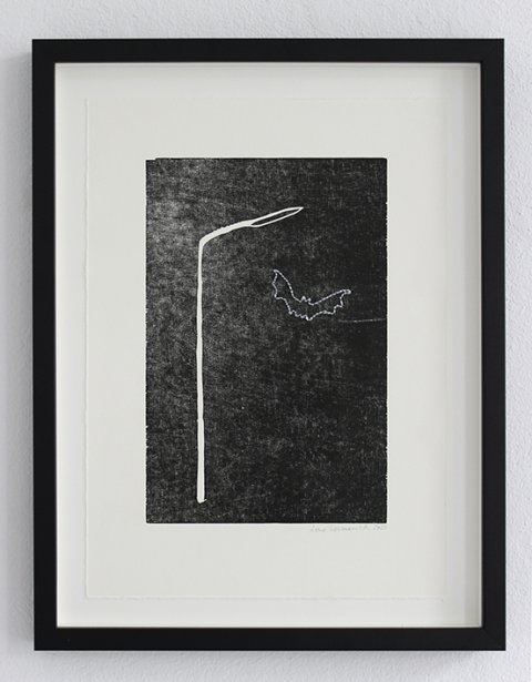 Lygtepælen er ligesom skiltet en figur, der lister sig ind i hendes værker fra tid til anden. De er begge en form for pejlemærker. Noget vi bruger til at orientere os med. Hun bruger lygtepælen som de surreelle fortællingers mødested, da det er der natsværmerne holder fagligt møde, duerne sidder og skider om kap, og det er i dens lyskegle, man ser en forhutlet ræv luske rundt i forstæderne.