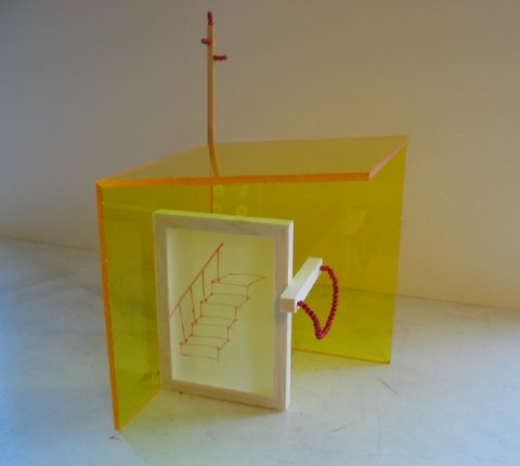 og fotoserien Doorways i baggrunden | ![]() Gult hjørne II Akryl, balsatræ, fyrtræ, træperler, tusch på kalkerpapir 20 x 20 x 20 cm. |