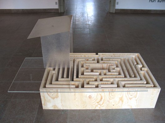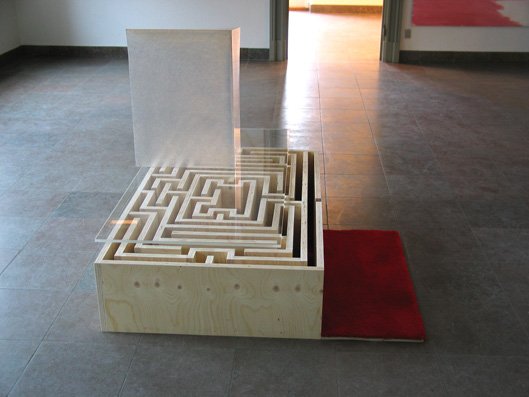 Labyrinten er husets sokkel består af et transperant hushjørne, hvorunder labyrinten former sig som min barndoms kryptiske kælder. Ud af labyrinten kommer der et rødt tæppe. Værket kan også være et billede på den lyse og mørke side i mennesket.