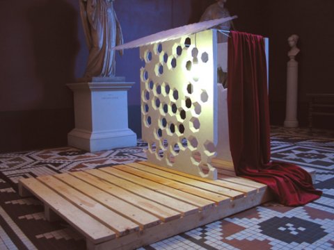 Hvid Carrara marmor, polycarbonat, træ, stål, uldstof, elpære.