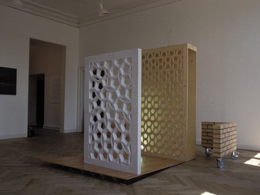 Jeg har sat den rå gulvpladefinér op mod det ophøjede klassiske hvide marmor, og det typiske danske laminatparketgulv og den gule murstensmur fra parcelhuset op mod de islamiske mønstre - som et møde imellem kulturer.