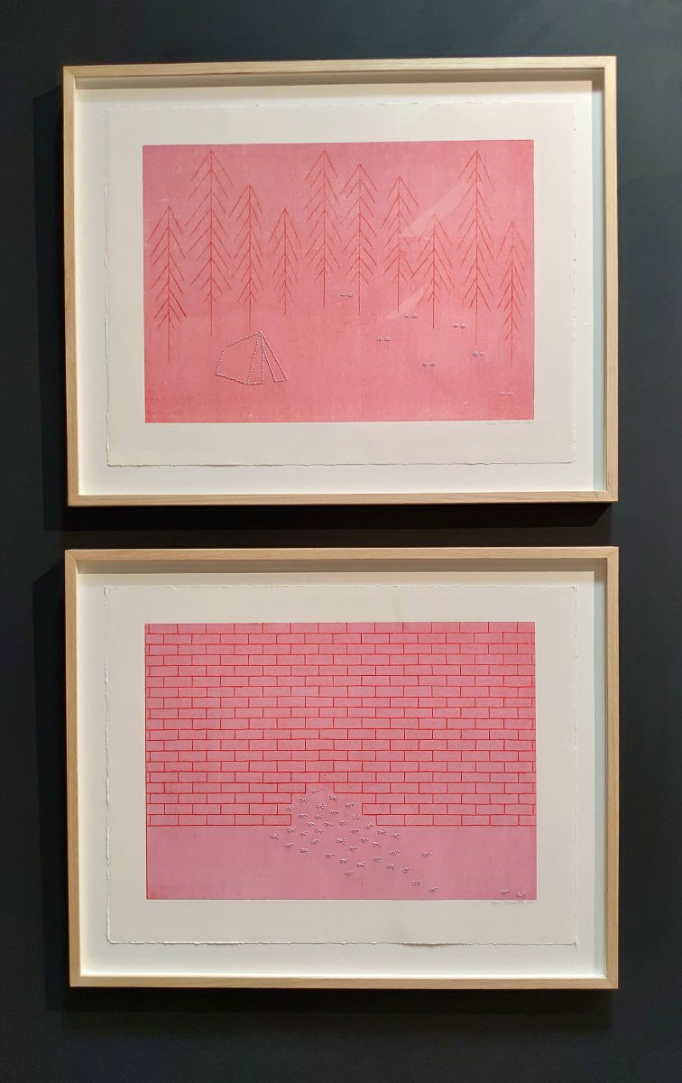 Mit bidrag er disse 2 tofarvede træsnit med broderi